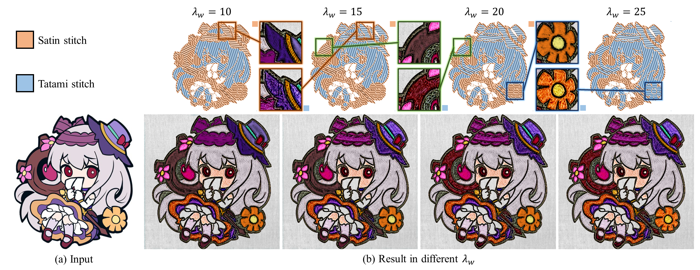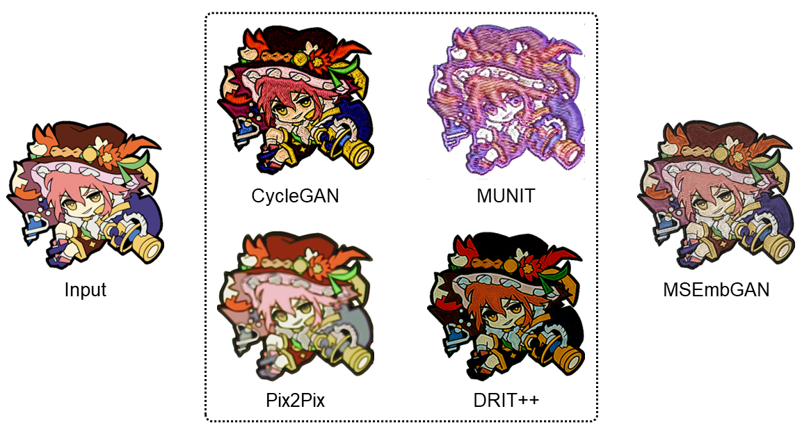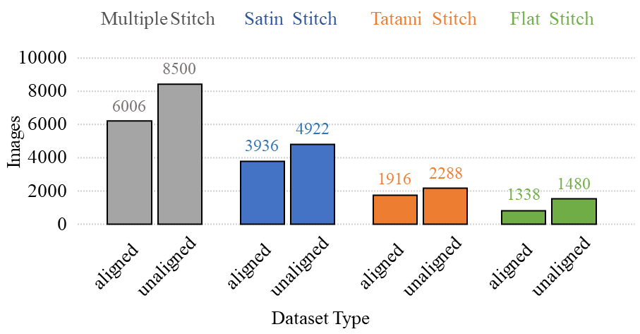 Convolutional neural networks (CNNs) are widely used for embroidery feature synthesis from images. However, they are still unable to predict diverse stitch types, which makes it difficult for the CNNs to effectively extract stitch features. In this paper, we propose a multi-stitch embroidery generative adversarial network (MSEmbGAN) that uses a region-aware texture generation sub-network to predict diverse embroidery features from images. To the best of our knowledge, our work is the first CNN-based generative adversarial network to succeed in this task. Our region-aware texture generation sub-network detects multiple regions in the input image using a stitch classifier and generates a stitch texture for each region based on its shape features. We also propose a structure generation network with a structural feature extractor, which helps achieve full image structural consistency by requiring the shape and color attributes of the output to closely resemble the input image. Because of the current lack of labeled embroidery image datasets, we provide a new multi-stitch embroidery dataset that is annotated with three single-stitch types and one multi-stitch type. Our dataset, which includes more than 30K high-quality multi-stitch embroidery images, more than 13K aligned content-embroidered images, and more than 17K unaligned images, is currently the largest embroidery dataset accessible, as far as we know. Quantitative and qualitative experimental results, including a qualitative user study, show that our MSEmbGAN outperforms current state-of-the-art embroidery synthesis and style-transfer methods on all evaluation indicators.
