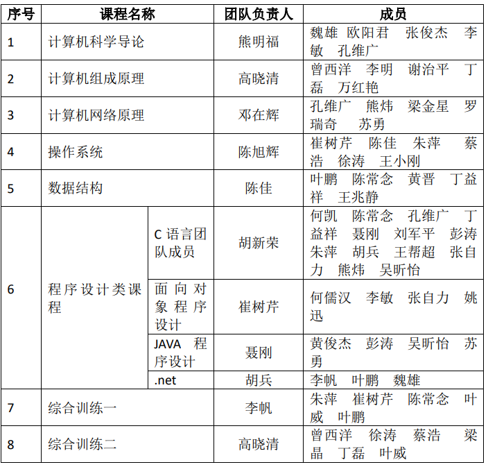 按照《开云kaiyun体育官方网站课程团队建设方案》,通过老师自愿报名,学院组织课程团队负责人说课,团队负责人和成员双向选择后确定计算机科学导论、计算机组成原理、操作系统等院管课程负责人及成员如下: