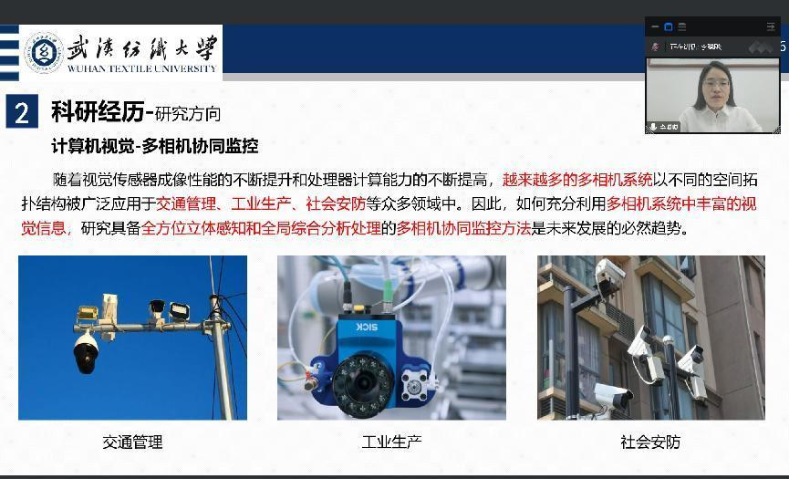 西安电子科技大学李聪聪博士为在线老师作题为“多相机协同监控关键技术研究”的学术报告。首先,他介绍了多相机系统被广泛应用后存在的众多问题,围绕多相机合成成像、联合标定和协同分析等方面,重点介绍了提高多相机协同监控关键技术的研究成果:提升单点监控感知能力的数据驱动可变孔径合成成像方法,提高多点监控互联能力的基于共性特征联合的多相机空间标定方法,基于交互一致性的跨相机目标关联方法等。