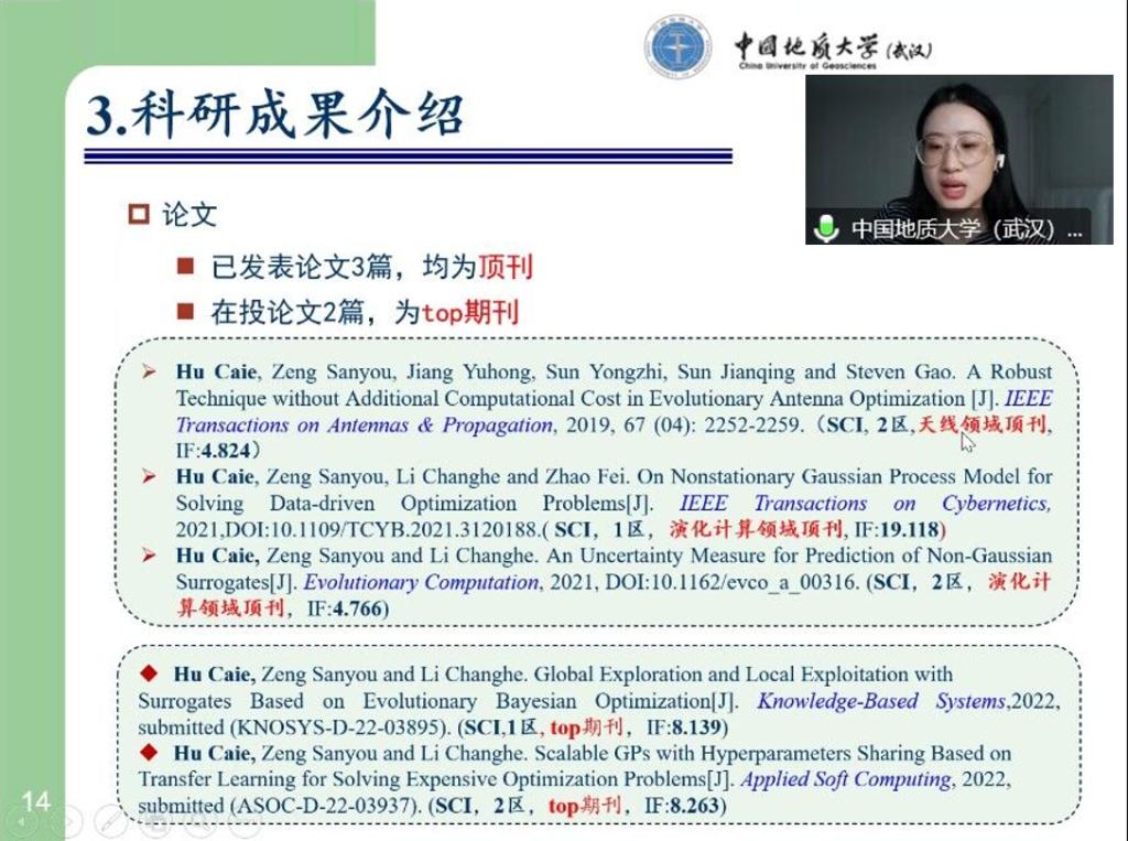 中国地质大学(武汉)呼彩娥博士作题为“基于模型协助的演化算法研究及其应用”的学术报告。天线是无线通信系统中重要的组件,被广泛应用于广播、点对点无线电通讯、雷达和太空探索等通讯系统,而天线设计问题通常是一类非线性、不可微、多峰值和电磁仿真耗时的优化问题,针对演化优化方法解决天线设计应用中的局限性,他提出了鲁棒技术以实现鲁棒演化天线,提出了非平稳高斯过程模型协助的演化算法以解决仿真耗时问题,提出了非高斯过程模型的不确定性衡量准则以解决现有机器学习模型中的不足。