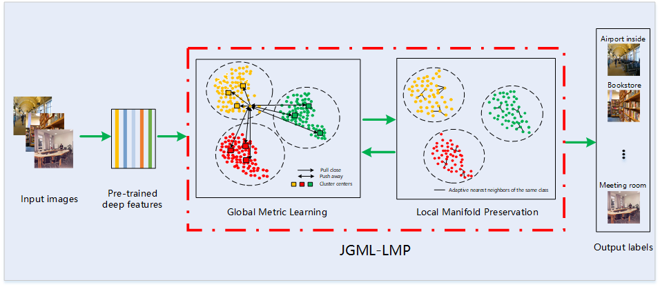 不同于一般目标图像,场景图像具有以下特性:类内高差异性,类间高相似性,光照不均匀,尺度多变性以及复杂的场景语义信息,这些给场景图像识别带来了巨大的挑战。为了应对这些挑战,基于预训练深度特征,首先,利用每个具体类的聚类中心设计一种新的全局度量学习方法,使得类内距离尽可能小而类间距离尽可能大,充分捕获全局判别信息。其次,为了利用局部流形结构,在新的度量空间中引入了自适应最近邻约束,以保持局部近邻结构。最后,联合全局度量学习和局部流形保持形成统一的学习框架(如下图),在场景图像数据集上的大量实验证明了所提出的算法提升了深度特征潜在的判别性和表达性,进而有效改善复杂场景图像识别性能。