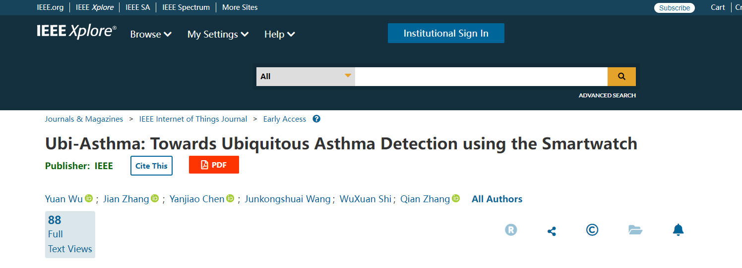 近日,开云kaiyun体育官方网站移动计算与智能穿戴团队青年教师吴渊博士在物联网与智慧医疗、物联网与人机交互方向取得了重要的研究进展。相关成果分别以“Ubi-Asthma: Towards Ubiquitous Asthma Detection using the Smartwatch”和“DMHC: Device-free multi-modal handwritten character recognition system with acoustic signal”为题发表在计算机领域中科院一区Top期刊《IEEE Internet of Things Journal》(ISSN:2327-4662)和中科院一区Top期刊《Knowledge-Based Systems》(ISSN:0950-7051)上。两篇论文的第一单位为武汉纺织大学,第一作者为吴渊博士。