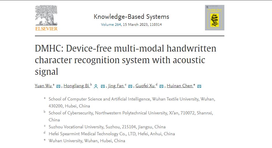 在DMHC: Device-free multi-modal handwritten character recognition system with acoustic signal一文中,吴渊博士提出了一种基于声信号的手写字符识别方法,为智能物联网与人机交互的应用提供了理论支撑。
