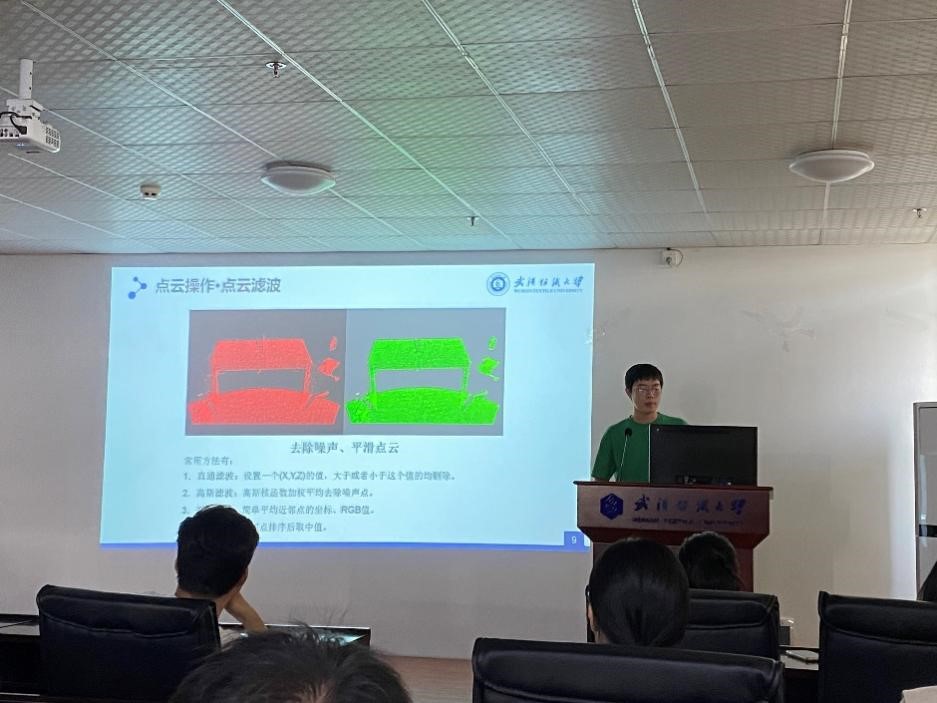 肖卓函同学分享主题是“点云数据技术与应用”,针对点云数据,他首先分享了它的数据存储格式、数据类型以及和2D图像间的比较。接着就点云技术中的点云分类、点云模型分割、点云场景分割、点云配准等内容进行了介绍,并分享了点云下采样、点云去噪常用的算法。对于未来点云在建筑重建、自动驾驶、文物修复等行业上的应用他也展开了说明,最后,他将实验室团队所做的人体三维测量、3D虚拟试衣技术的技术路线也作出了简要的介绍。