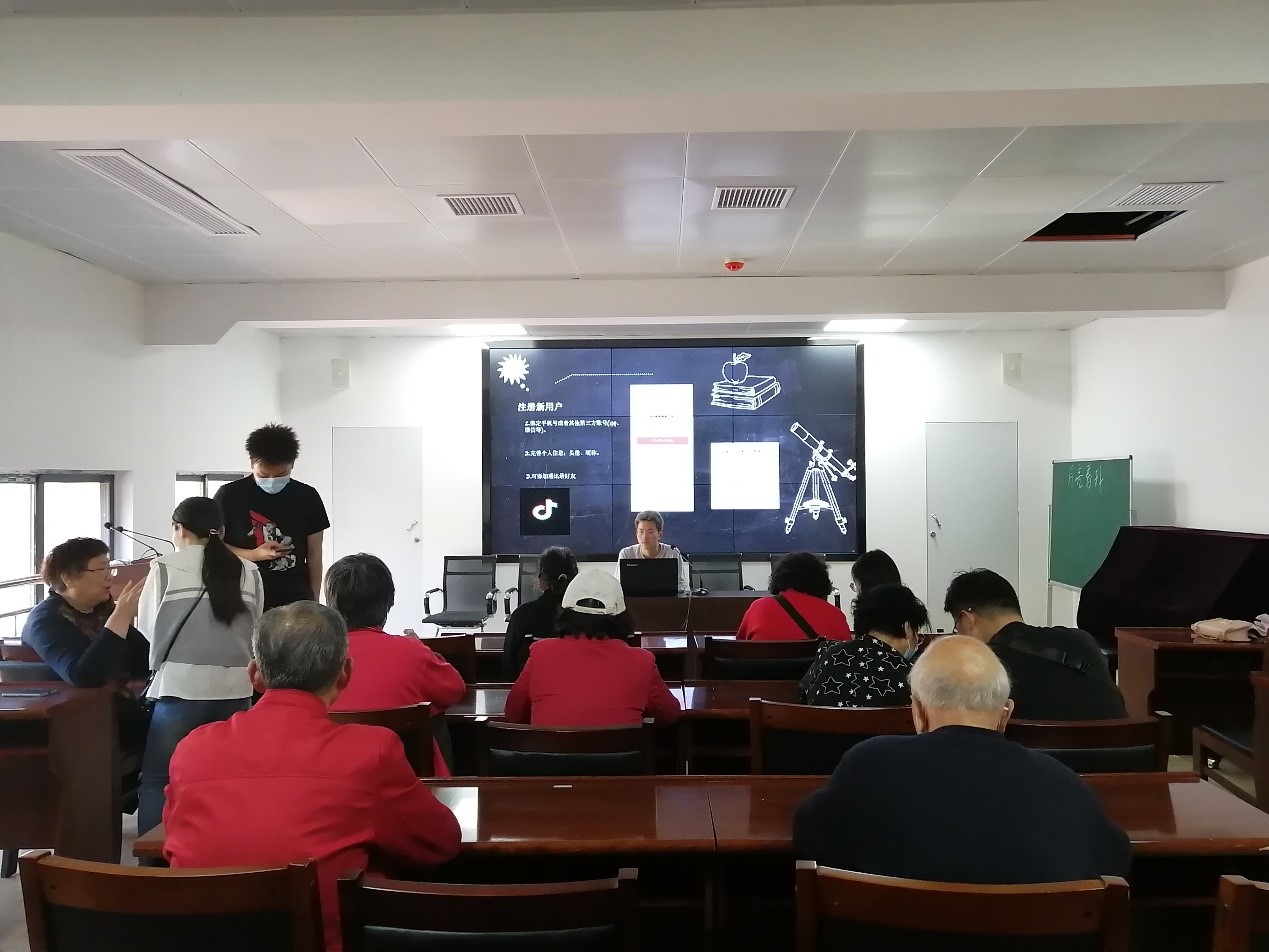 主讲人向昶从下载、注册、完善个人信息、添加好友到拍摄发布视频,按步骤耐心进行讲解,其他人分散站在老人们身边,细心解决老人们在操作过程中遇到的问题。