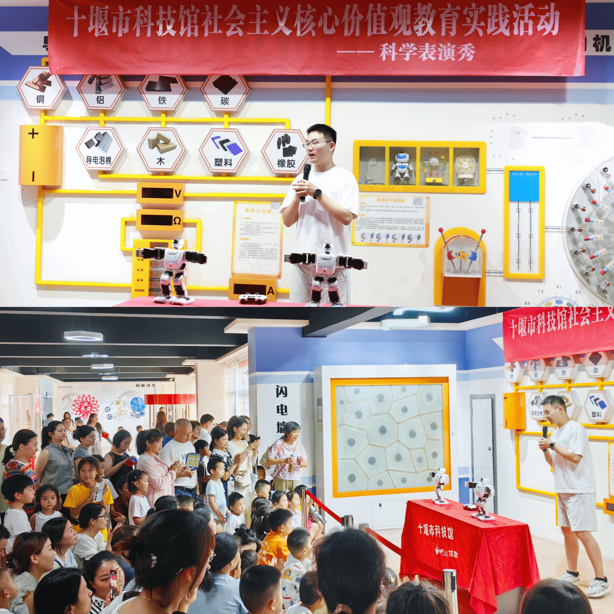 结合十堰市科技馆“每周一秀”品牌活动,实践团带来了四台人形机器人。机器人随着《江南 style》的节奏灵动起舞,孩子们看得十分兴奋,现场气氛热烈。表演过程中,实践团将学校特色与科技元素深度融合。当武汉纺织大学校歌旋律响起,机器人通过精准的程序控制,机械臂随着音乐节奏变换出多样造型,同时,机器人按照编程指令,准确抓取、搬运物品,展示了人工智能的精确性。