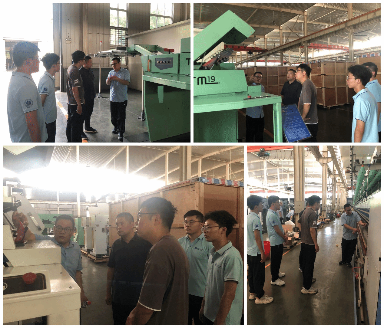 天门纺织机械股份有限公司董事长沈方勇携项目主任李静、自动化部部长王卫对实践团的到来表示热烈欢迎。实践团的成员来到纺织机械工厂内,参观目前厂内先进的纺织机械——并条机系列和细纱机系列。并对智能化技术的关键难点:提升条桶的工作效率进行交流探讨,且初步达成共识。