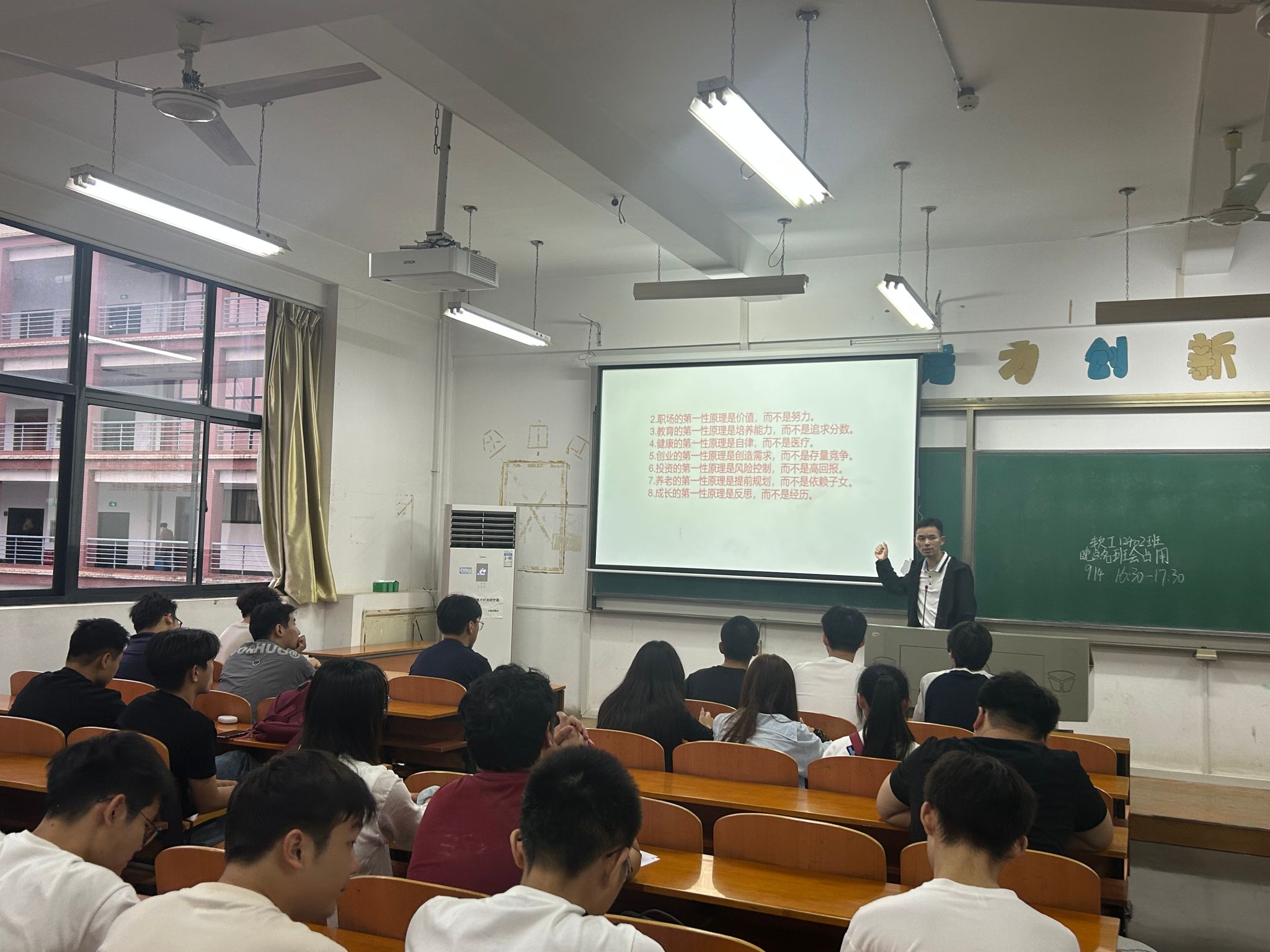 班会首先进行晚点名,核实学生返校情况,对未返校学生进行联系并确认返校时间,做好安全管理。随后学习教育部关于教师节的通知精神,围绕"胸怀天下、启智润心、求是创新、乐教爱生"的教育家精神开展讨论。