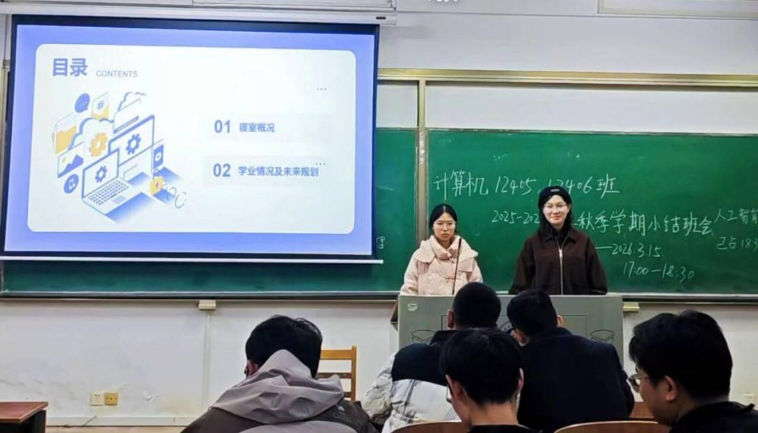 为深入总结2025-2026学年第一学期学业情况,查找存在问题,明确努力方向,进一步巩固学风建设成果,计算机12406班于3月15日下午在崇志楼举行“大二上学期学业总结暨新学期规划班会”。班会由班长高智翔主持,班主任黄俊杰老师、辅导员李港老师及全体同学参加。班会寝室为单位的典型经验分享形式展开,旨在促进同学互学互鉴、补齐短板、凝聚共识,共同向“零挂科、高质量就业考研”目标迈进。