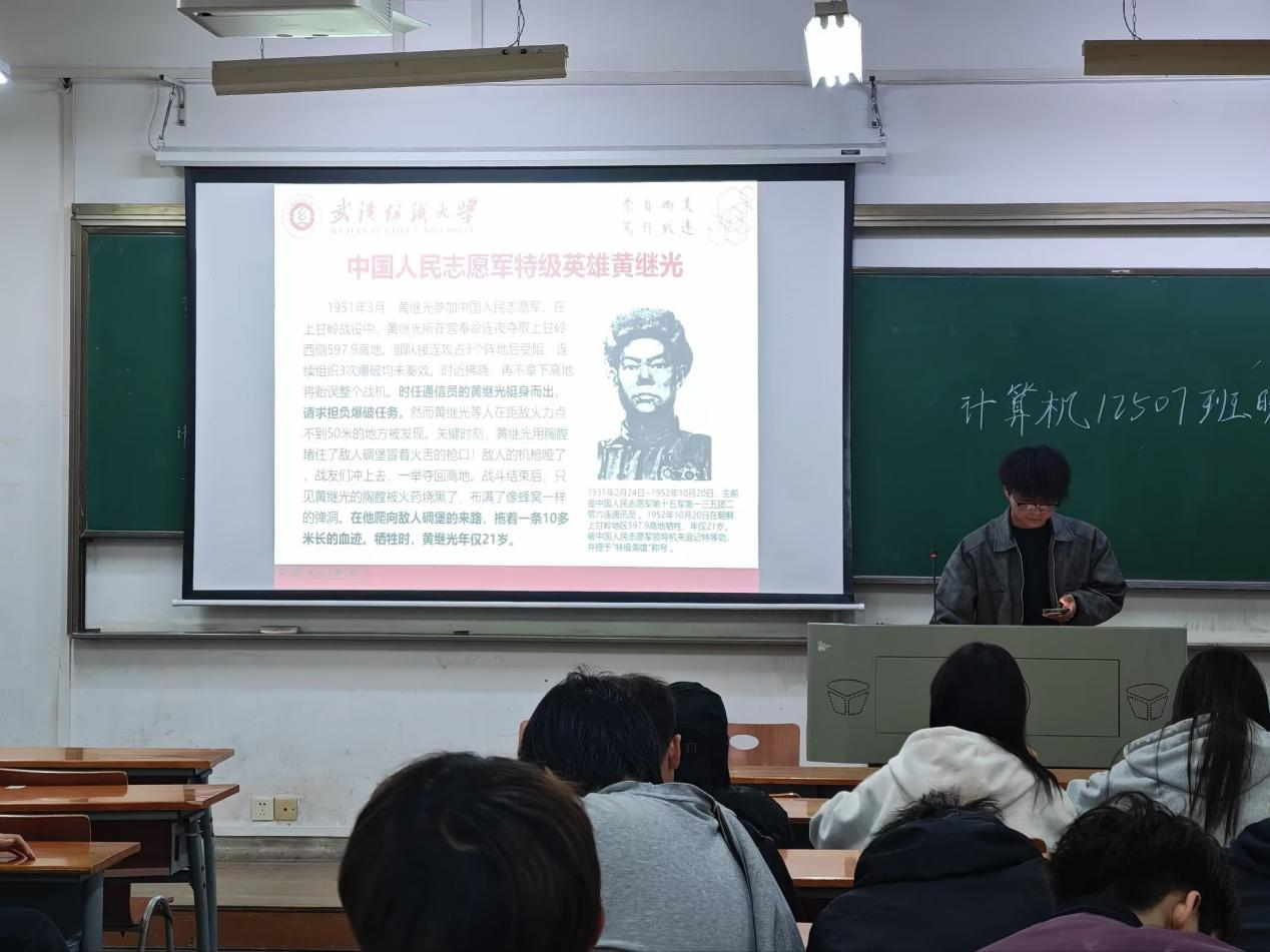 班会第一环节,各班集中开展“缅怀革命先烈,砥砺奋进征程”主题思政学习。同学们集体学习革命先烈事迹,重点聆听了中国人民志愿军特级英雄黄继光的英雄故事,感悟他在抗美援朝战场上用胸膛堵住敌人枪眼、舍生取义的崇高精神,深刻理解革命先辈为国家独立、民族复兴所作出的巨大牺牲。同时,同学们还学习了清明节的起源与文化内涵,了解这一传统节日承载的慎终追远、缅怀先辈的文化意义,引导同学们以先烈为精神航标,将个人理想融入国家发展战略,在新时代传承红色基因、勇担青春使命。
