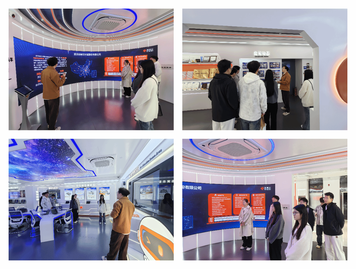 在噢易云工作人员引导下,师生们先后参观了公司展厅与智慧校园演示区。讲解人员详细介绍了噢易云在数智化教育、信创桌面云、AI算力平台等领域的最新成果,包括噢易AI桌面服务平台、噢易AI算力开放平台、鸿蒙版电子教室及桌面云系统等核心产品。师生们对公司在“AI+教育”及智慧实验室建设方面的创新实践表现出浓厚兴趣,并就技术应用与产业趋势进行了现场交流。