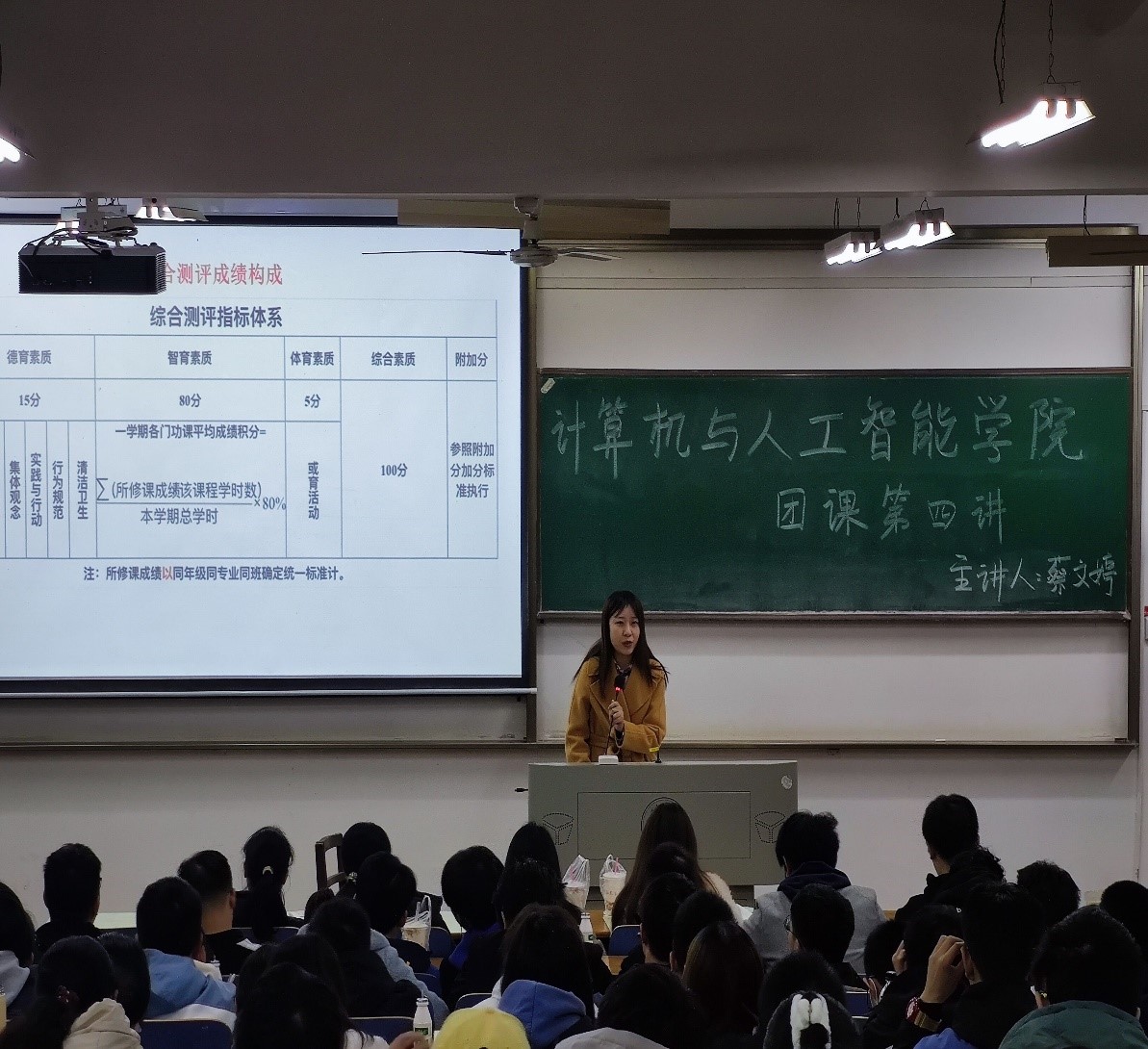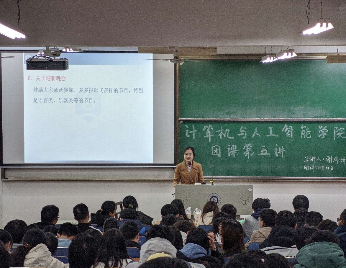 为促进新生更好的了解党团知识,产生积极向党组织靠拢的动力心向;加深新生对专业的理解与认知,提升大学学习规划的合理性和科学性;提升学生干部对工作的熟悉度及能力水平;进一步加强新生对校规校纪的了解,增强对所学的专业以及未来就业方向的认识,近日,开云kaiyun体育官方网站邀请了学院党委副书记涂耀威、软工系史爱武博士、学院团委书记廖龙以及辅导员蔡文婷与谢瑞清等老师分别于10月7日14:20,10月24日16:30,11月21日17:30在3号教学楼T202、319、T102和218教室为新生作了《你为什么入党》、《大学4年,怎样成为优秀的自己》以及主题为“如何当好团的学生干部”、“从就业看职业规划”、“校纪校规教育”的主题讲座。