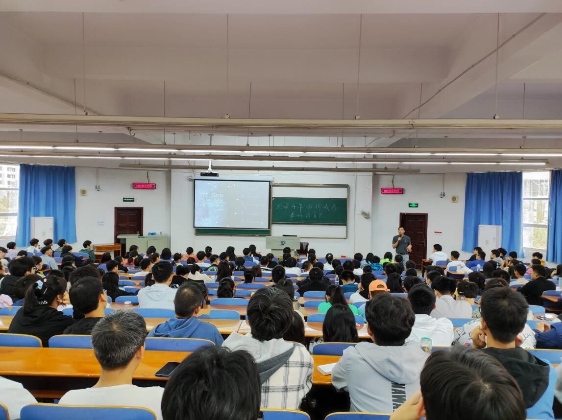 史爱武博士分享了五点经验与要求。首先是规划,他详细谈了有目标与无目标的学生截然不同的生活状态,指出了在当下做好大学四年规划的重要性。“没有规划的人生叫拼图,有规划的人生叫蓝图。”第二,教导同学们要怀有敬畏之心,敬畏知识、敬畏课堂、敬畏师长。第三,教导同学们要有态度,给出了“成功=态度*能力*努力”的公式,向同学们强调态度的重要性,不仅是学习,生活也是如此,做人更是如此。他还向同学们提出了大学最重要的学习方式——自学,和最重要的学习过程——实践,从实操性的角度上向同学们讲述了大学的学习方法。“知而不行,只是未知”,史博士发出殷切期待,希望同学们能把耳朵听到的成为转到手上做到的,做到知行合一。