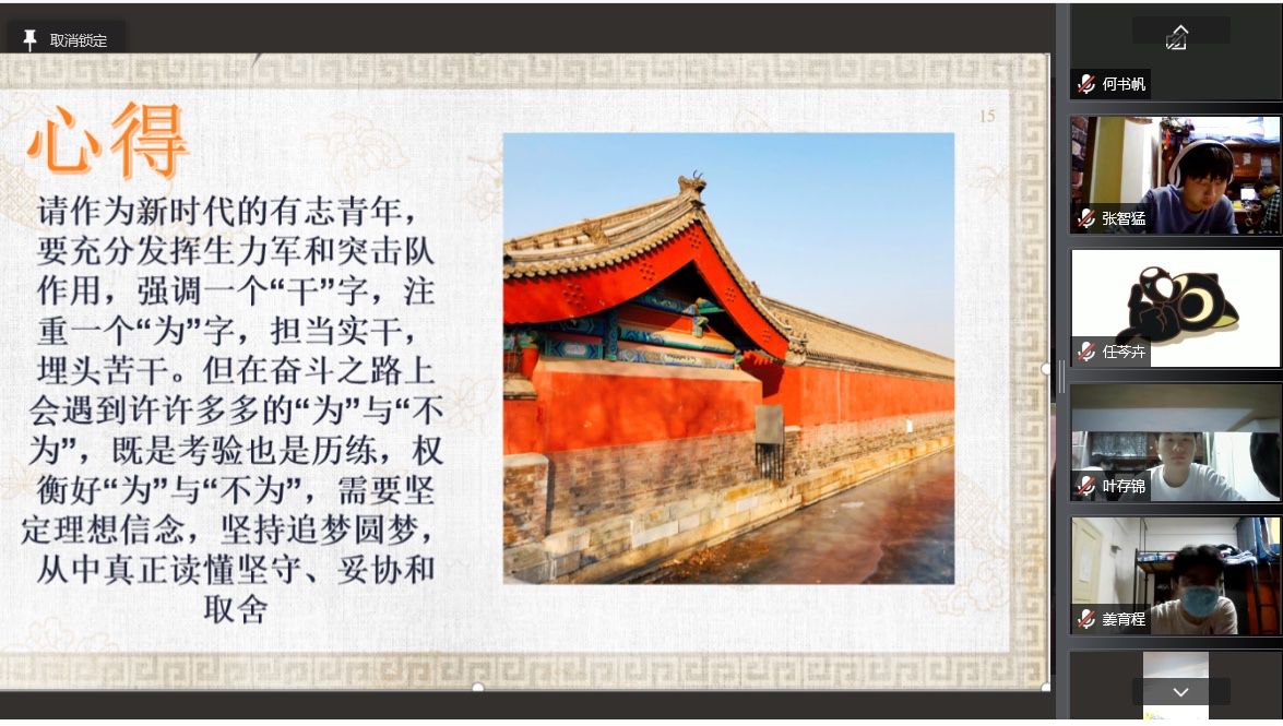 结合疫情要求,除了通过线上主题班会、主题党团日活动等形式组织同学们学习两会内容以外,学院还提倡同学们结合实际,通过各种渠道进行自学。