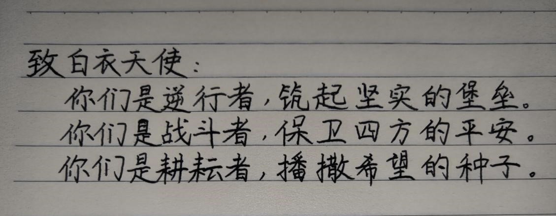 活动主题一是“爱你千万,纸短情长”。同学们通过网络知晓一批人在疫情的洪流下逆行而上,他们可能是医生,可能是军人,哪里危险,哪里需要他们,他们义务反顾。活动通过写下“三行情书”来对他们“告白”,传递积极向上正能量。