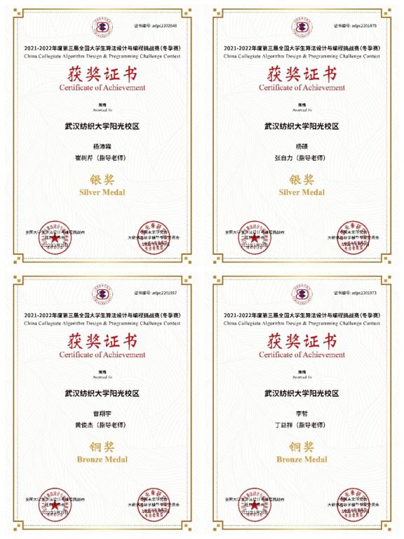 自今年1月份以来,ACM俱乐部学生已经多次获奖。在第四届“传智杯”全国大学生IT技能大赛中,获得区域赛一等奖(5%)1名,区域赛二等奖(15%)13名,区域赛三等奖(20%)14名。第三届算法设计与编程挑战赛(冬季赛),由中国未来研究大数据与数学模型专业委员会举办,中国未来研究生是中国科协下属团体。在该赛事中,ACM俱乐部学生获得银奖(10%)5名,铜奖(20%)7名。