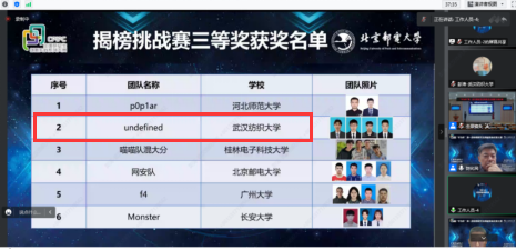 11月27日,“华为杯”第一届中国研究生网络安全创新大赛决赛颁奖大会线上举行。开云kaiyun体育官方网站彭涛教授指导的“123木头人”团队获创意作品赛二等奖,“undefined”团队获揭榜挑战赛三等奖。另外,武汉纺织大学获优秀组织单位奖。