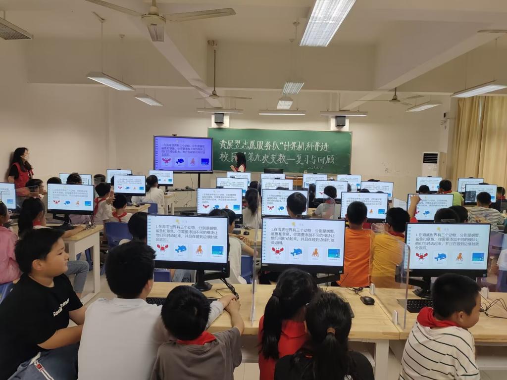 志愿者在小朋友们心中种下的“计算机科普”小苗相继开花结果,我们也快到了要和孩子们说再见的时候了。高年级同学迎来了考试前最后一节复习课,志愿者们课前进行了反复的斟酌考虑择出最具代表性和趣味性的题目,并进行知识点的分类与阐释。先做题再讲题从而确保孩子们能够完全吃透每一个编程细节。屏幕上海底世界里,小朋友们举一反三,让更多的动物在水里来回遨游;绿色的森林里,小鸟变换姿态地飞行,被狙击后迅速不见……优异的做题结果让志愿者们内心无比自豪,也对下一次课孩子们即将交出的考卷充满期待。