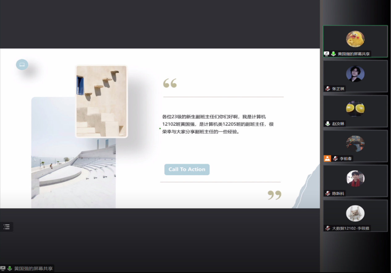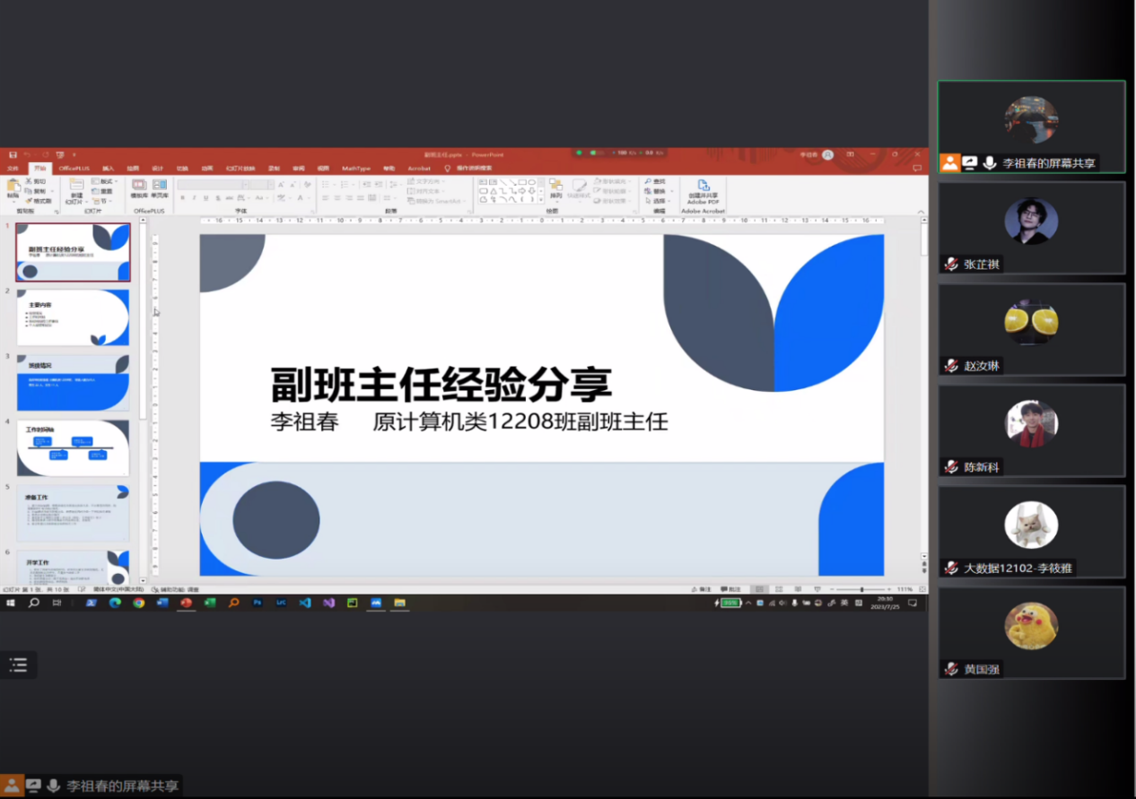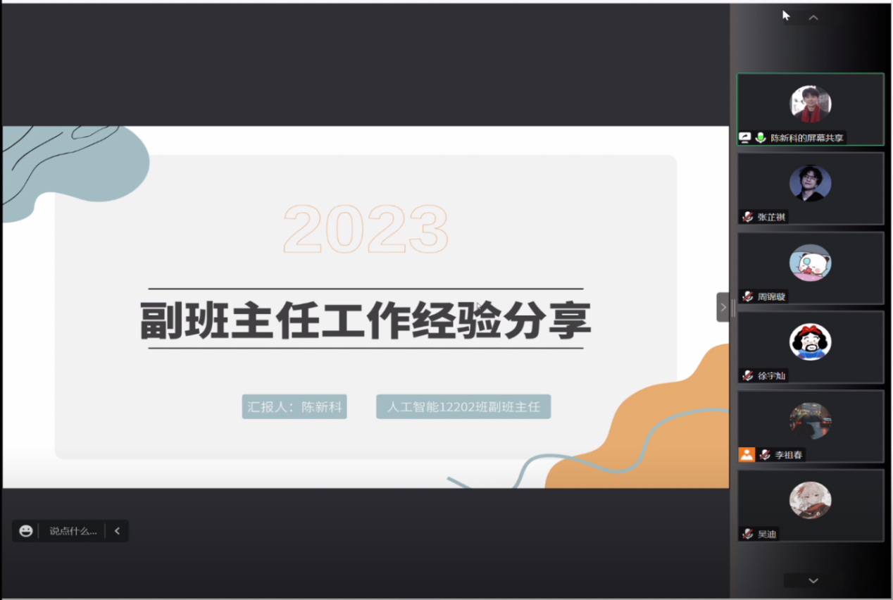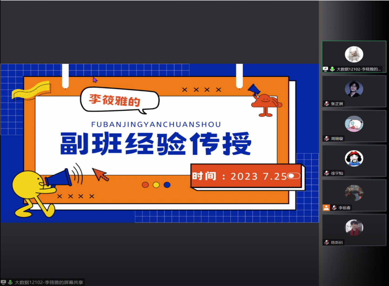 为帮助2023级副班主任尽快适应角色、熟悉工作、明确职责、提升工作能力,开云kaiyun体育官方网站学生会团队于7月25日在线上开展了优秀副班主任经验分享会。本次分享会由五位2022级优秀副班主任以及2023级本科生辅导员易凡老师主讲,全体2023级副班主任成员参加,共同分享交流。