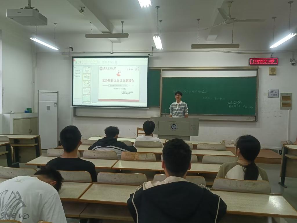 班会伊始,辅导员进行晚点名工作,对还未到场同学逐一进行联系。辅导员在班会上向同学们介绍了世界精神卫生日的由来和发展历程,并介绍学校在下半年即将开展的各类心理活动,鼓励同学们积极参加,利用心理活动舒缓学习生活中的各种压力。
