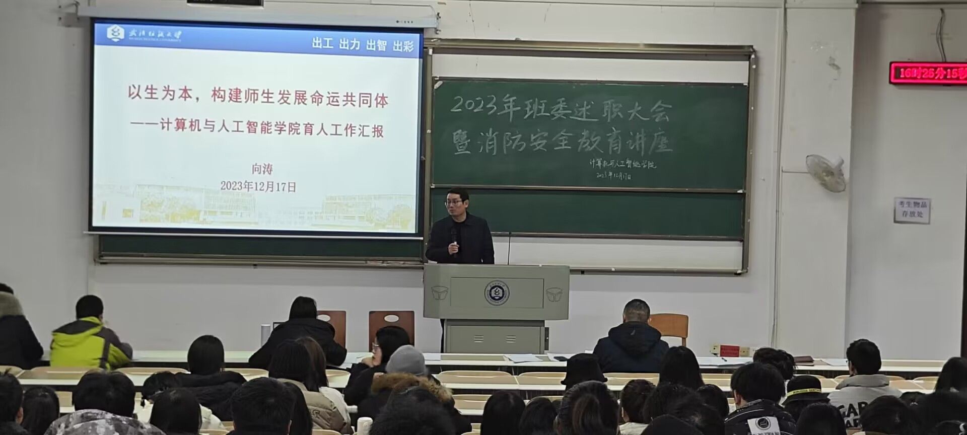 随后各班级班委干部代表进行了年终述职汇报,通过PPT形式展示了过去一年班级工作成果,包括班级纪律、学习氛围、团队建设、活动组织等方面取得的成效和存在的问题以及拟解决的措施。各班级述职完毕后魏雄对各班级的述职汇报进行了点评,对各班级取得的成效给予了肯定和鼓励,同时也对需要改进的地方提出了建议。