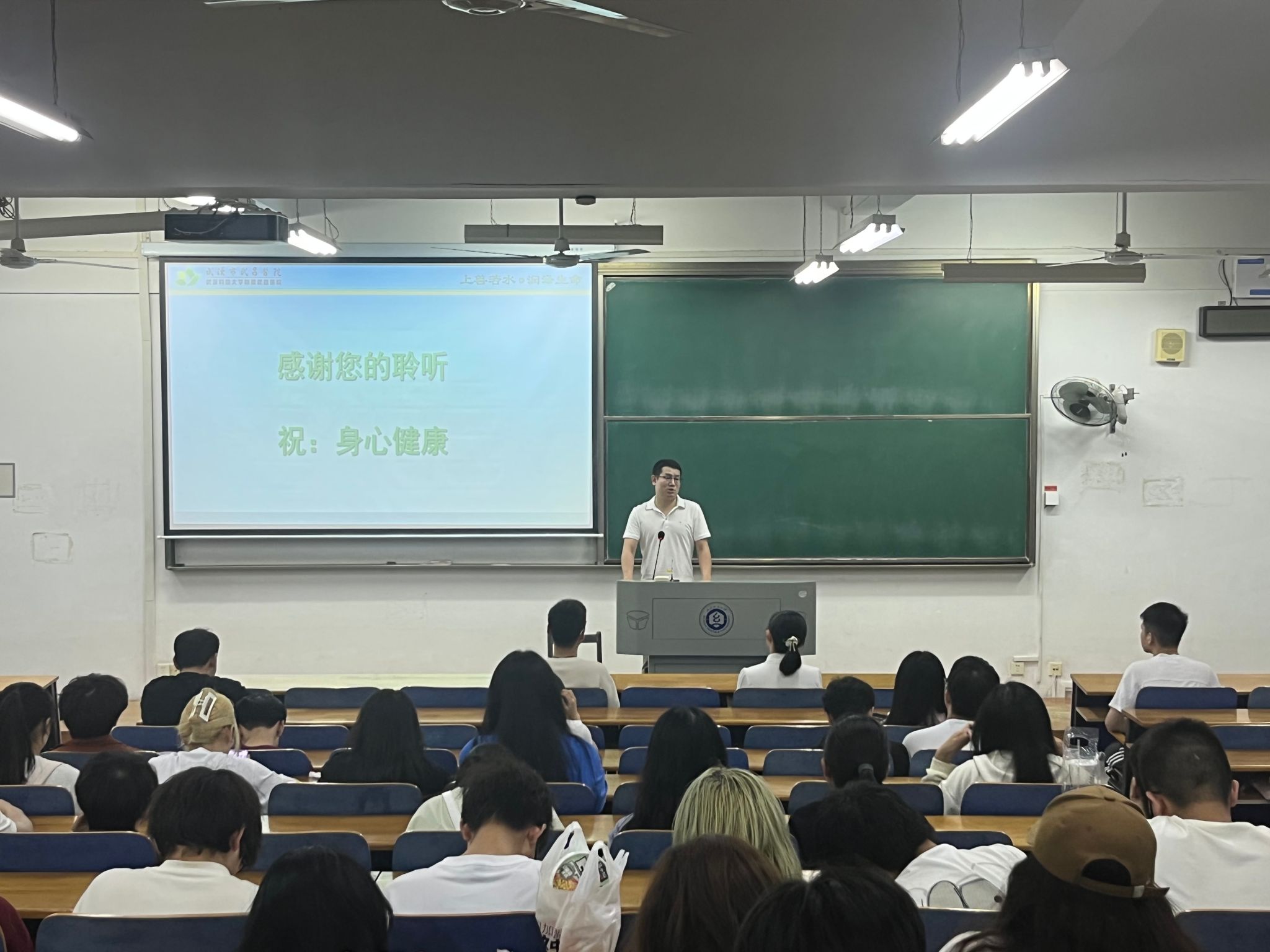 张立国首先引出话题,问同学们健康的标准是什么?张立国通过两个小测试让同学们感受一下自己当前的状态,存在哪些压力等。随后张立国向同学们介绍了武昌医院长期以来对心理帮扶的具体措施,引导同学们正确看待心理问题,积极帮助身边有需要的同学。张立国还为同学们分析了疫情以来大学生出现抑郁、焦虑等情绪的原因,张立国强调情绪与个人的态度是紧密相连的。在生活中,一个有积极乐观态度的人,往往会有更多的积极健康的情绪表现,我们可以通过改变自己的态度来控制自己的情绪。最后张立国介绍了焦虑、抑郁障碍、抑郁症、躁狂、强迫症、精神分裂等症状的具体表现,提醒同学们多加关注有行为异常的同学,及时报告给学校老师们知晓,从而使得自己的同学能得到及时、有效的帮助和治疗。