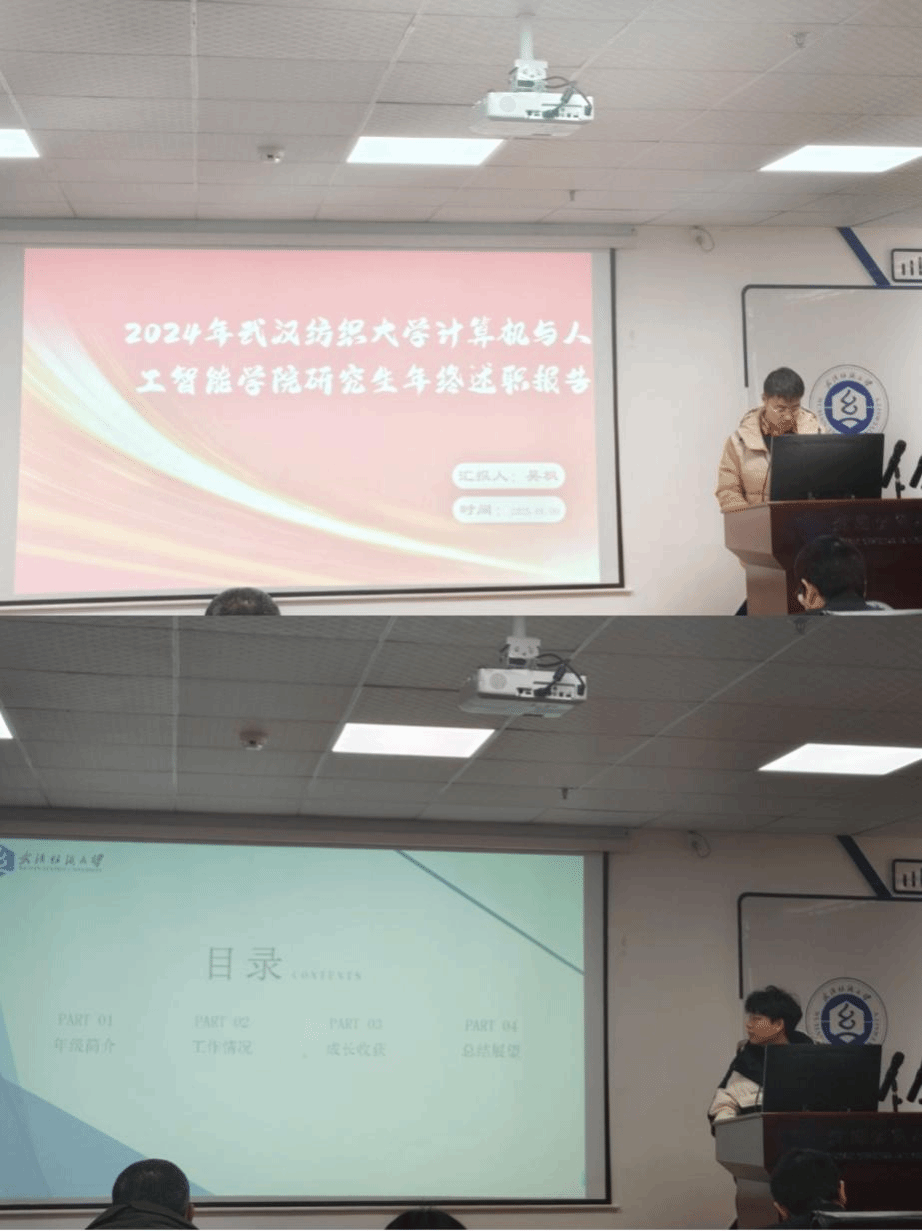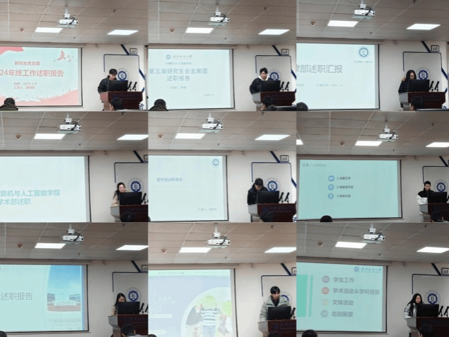 随后,研究生党支部秘书助理苗佳哲、研究生会学生干部主席桂凌、纪律部部长李珠婷、学习部部长成子惠、宣传部干事魏逸飞、文体部副部饶忠睿、秘书部部长贺昕宇、黄展翌志愿服务队队长冯润泽、三位年级长2024级范梦琳、2023级吴枫、2022级史盛源依次进行述职,汇报了2024年的工作情况,个人的收获以及未来展望等。