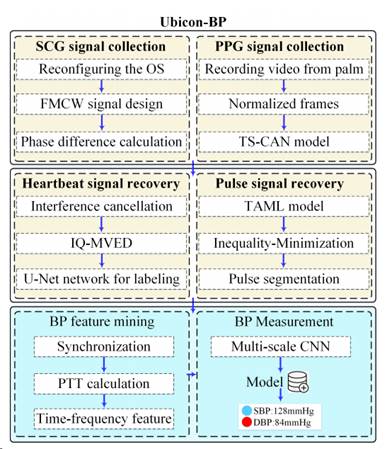 血压是与心力衰竭和肾损伤等严重疾病密切相关的重要生理参数。现有方法要么需要额外或专用硬件,要么要求与设备紧密接触,导致不适与不便。因此,开发一种便捷、非接触式的血压测量解决方案具有迫切需求。本研究提出Ubicon-BP 一种普适性、无设备依赖、非接触式的血压检测应用。该系统基于医学证实与血压相关的关键特征参数脉搏波传导时间(Pulse Transit Time, PTT)进行血压计算。然而,利用智能手机传感器实现非接触式PTT测量面临重大挑战,因其需要微秒级精度的心脏事件检测能力。为解决这一难题,我们创新性地结合智能手机声学传感器检测心脏瓣膜运动引发的振动信号,以及摄像头传感器捕捉指尖脉搏信号。针对易受运动干扰的心跳信号检测,首先提升声学信号感知粒度,继而提出IQ-MVED模型有效消除运动伪影。在视频信号提取脉搏波方面,针对泛化性能不足等问题,开发TS-CAN网络与元学习模型实现个性化脉搏信号重建。最终,通过提取重建心搏与脉搏信号的时频特征映射实现血压计算。经50名受试者综合测试,系统在舒张压和收缩压测量中分别取得4.27mmHg和6.36mmHg的标准差精度。