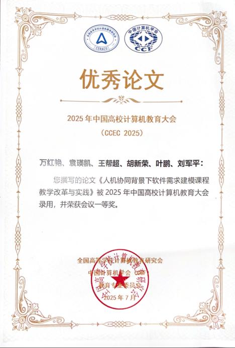 近日,在银川举办的2025年中国高校计算机教育大会(CCEC 2025)上,我院胡新荣教授团队万红艳、王帮超、叶鹏、刘军平老师的研究成果《人机协同背景下软件需求建模课程教学改革与实践》在激烈评比中脱颖而出,荣获优秀论文一等奖,并推荐到《计算机教育》期刊出版。