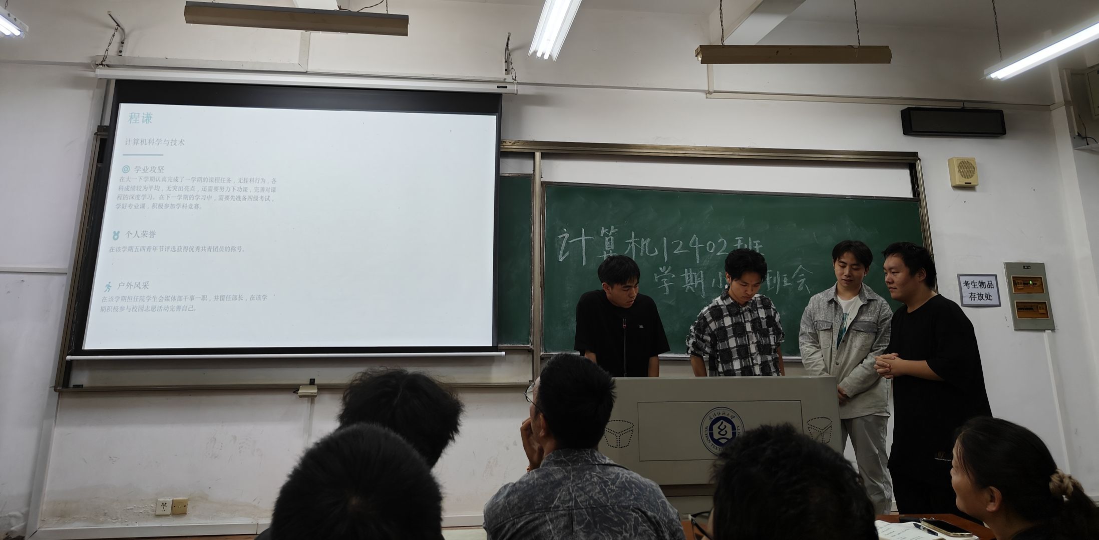 本次班会以总结学期情况、明确未来方向为主题,班级学生以寝室为单位,分别围绕基础学业情况、学科竞赛获奖情况、学生活动参与情况及寝室卫生情况、未来发展规划展开详细汇报。