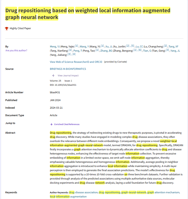 孟亚洁博士的论文《Drug repositioning based on weighted local information augmented graph neural network》直指“AI+生物医药”交叉领域的关键问题——药物重定位。针对生物医学网络数据稀疏、关系复杂的挑战,研究团队创新性地提出了DRAGNN模型。该模型通过增强局部邻域信息、利用异构图注意力机制,显著提升了药物-疾病关联预测的准确性。实验不仅验证了其在多个基准数据集上的优越性能,更在帕金森病和乳腺癌的案例中成功预测出多种具有文献支持的候选药物,展现了强大的实际应用潜力。