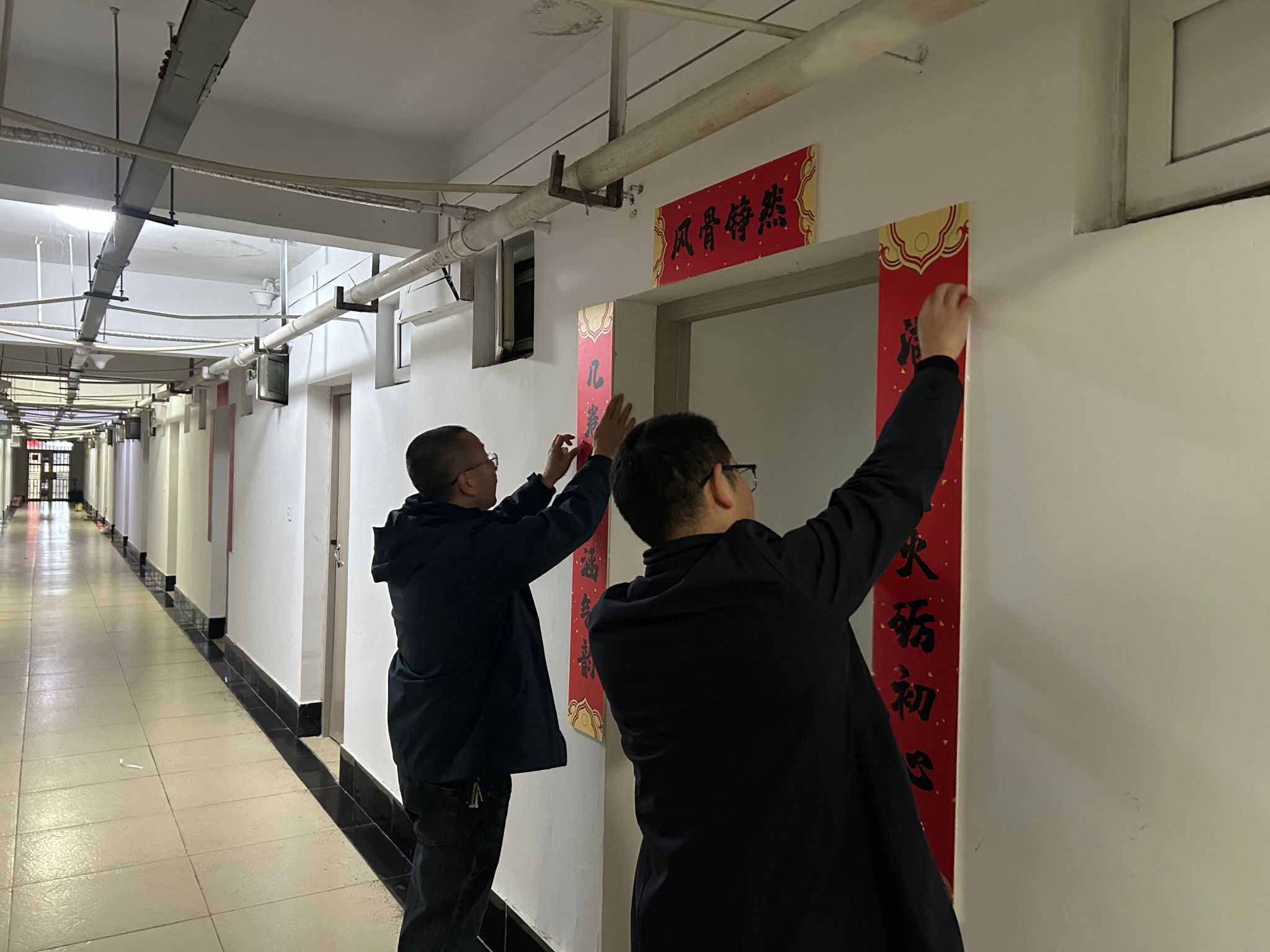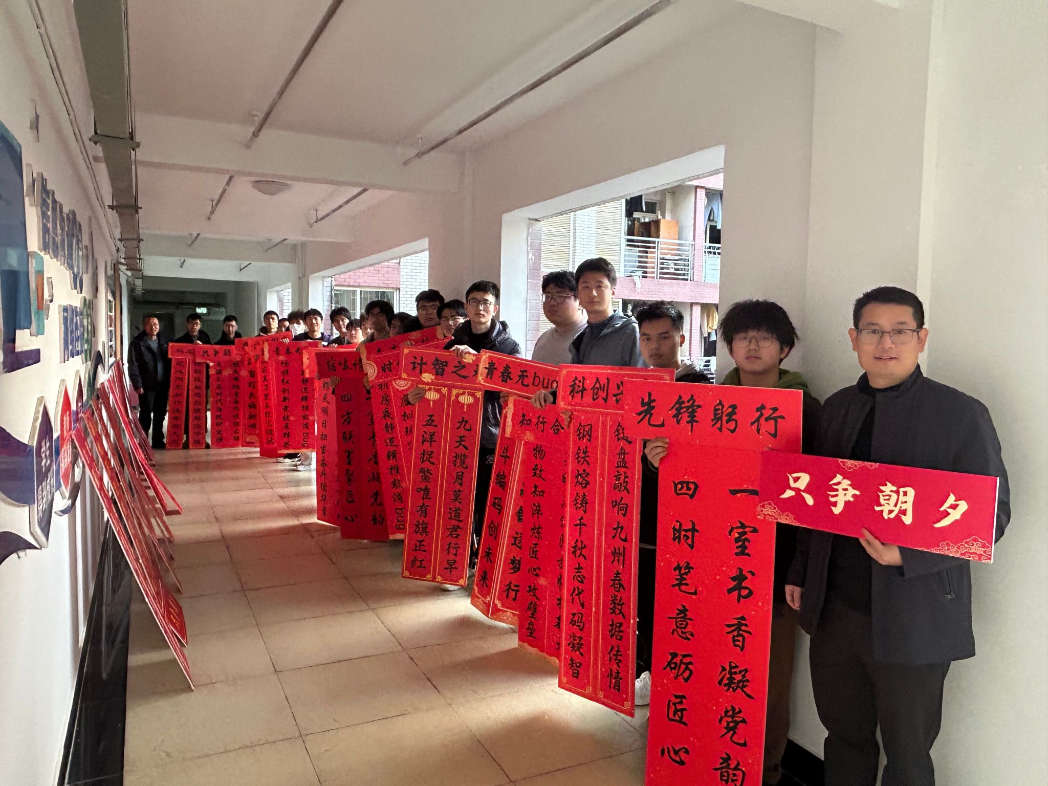 活动自启动以来,得到了学院各寝室同学的积极响应和热情参与。同学们以寝室为单位,围绕“红韵”主题,巧妙构思,将红色元素、励志名言与传统楹联相结合,充分发挥创意,精心装点“小家”。开云kaiyun体育官方网站党委书记晏伟、副书记向涛,在活动中亲自为寝室张贴对联,对同学们表达新春的祝福!