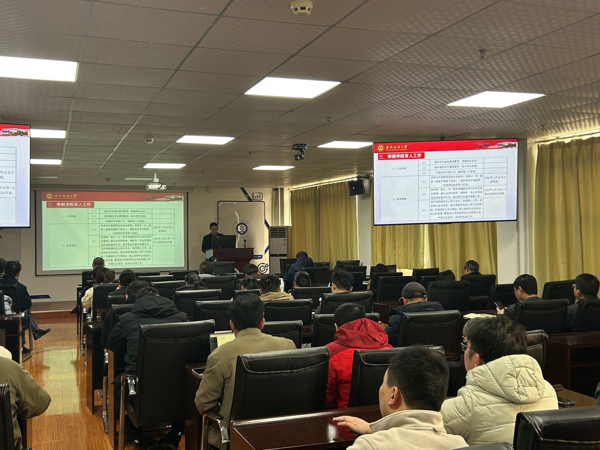 随后,会议重点告知了班主任们学生寒假离校的相关安排,包括离校时间节点、安全注意事项、假期去向报备要求等关键信息,确保每一位班主任都能清晰掌握具体事宜。