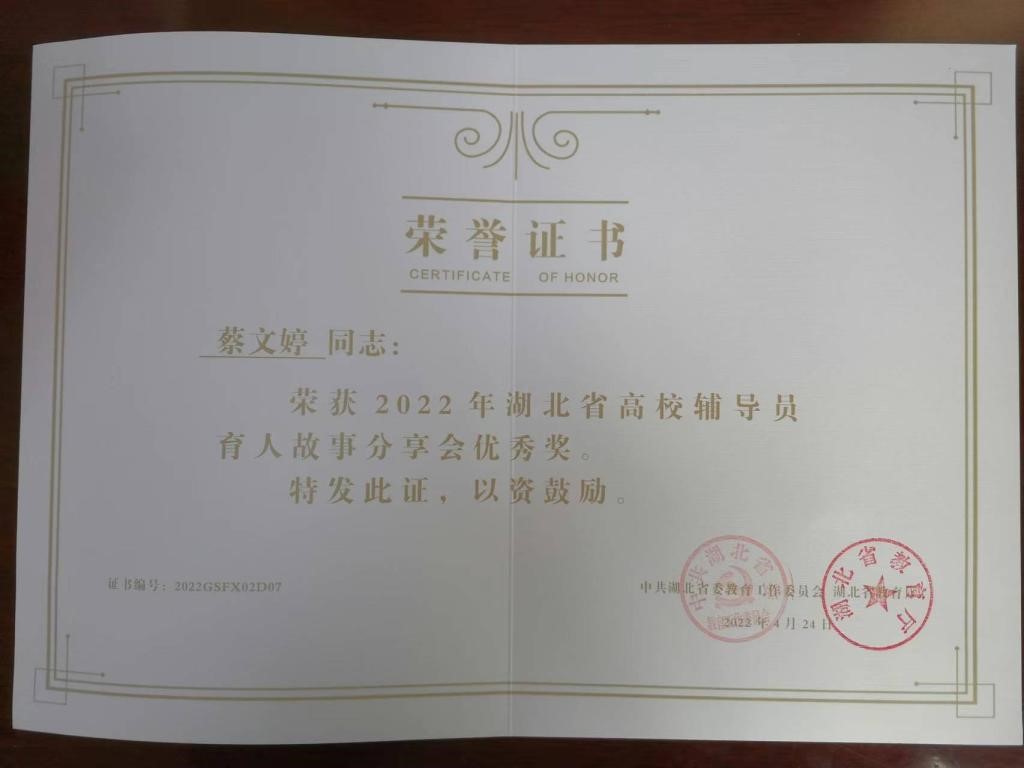 4月20日-21日,湖北省第十届高校辅导员素质能力大赛暨2022年育人故事分享会在华中科技大学举行,经过激烈角逐,我院辅导员蔡文婷老师在辅导员育人故事分享会中获优秀奖。