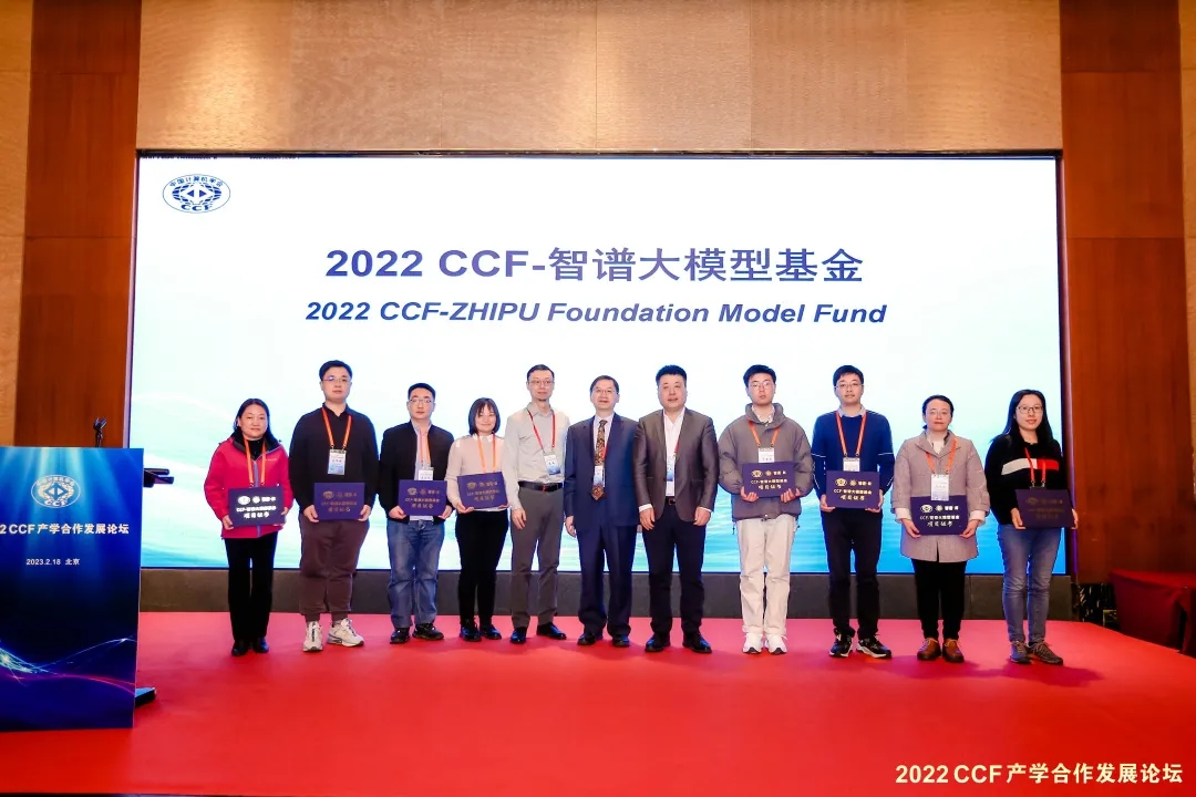 从左至右分别为:武汉纺织大学胡新荣、中国人民大学高泽峰、南京航空航天大学李丕绩、北京理工大学胡琳梅、智谱CEO张鹏、CCF副理事长周明、智谱总裁王绍兰、北京工商大学于重重、复旦大学桂韬、桂林理工大学谢晓兰、安徽大学赵姝