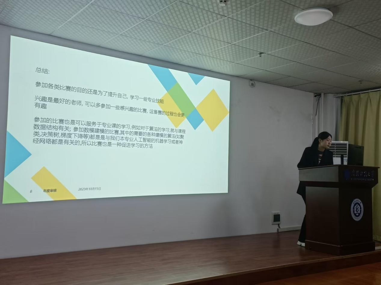 本次活动也同步组织了朋辈分享会,邀请了2021级人工智能专业谢飞和张祉云两位同学做了学习和竞赛分享。谢飞通过分享自己的学习经历,向大家介绍了四个提升编程能力的网站,并重点分析了国际大学生程序设计竞赛(ACM-ICPC)的规则与流程。在分享中,他强调了将编程视为兴趣而非功利的重要性,并结合自身经历提出了一些建议,帮助同学们培养兴趣。张祉云在分享中详细介绍了中国大学生数学建模竞赛,并将“人工智能”和“数学建模”作为两个关键词,为同学们带来了有关这两个领域的专业知识和实践经验。她强调了学习过程中面临困难的普遍性,提醒同学们要直面困难挑战,认真学习创新算法思想,不断充实自己的专业能力。同时也鼓励同学们积极参与各种比赛,通过参加比赛接触各种各样的问题和挑战,激发自己的求知欲望和创新思维,系统地梳理知识体系,增强团队合作能力,并不断提高自己解决问题的能力。
