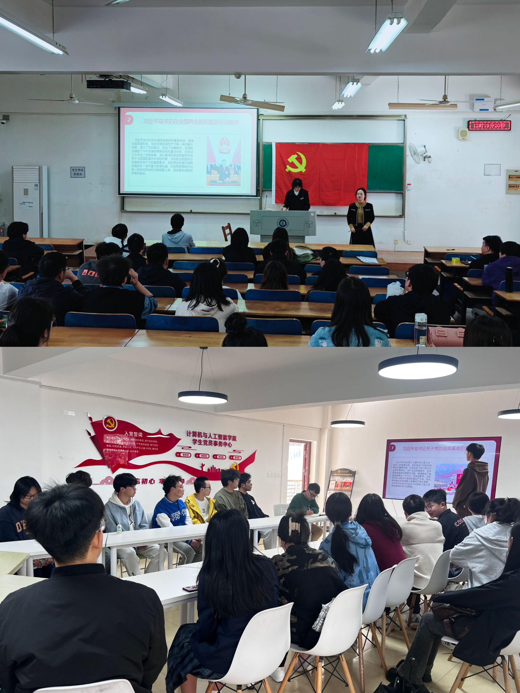 各学生党支部书记带领学生学习习近平总书记在全国两会期间的重要讲话精神,号召同学们要全面学习领会习近平新时代中国特色社会主义思想,把握好这一思想的世界观和方法论,转化为坚定理想、锤炼党性的强大力量。同学们纷纷发言,结合两会热点话题以及自己的学习、工作和生活等情况,进行了热烈讨论。
