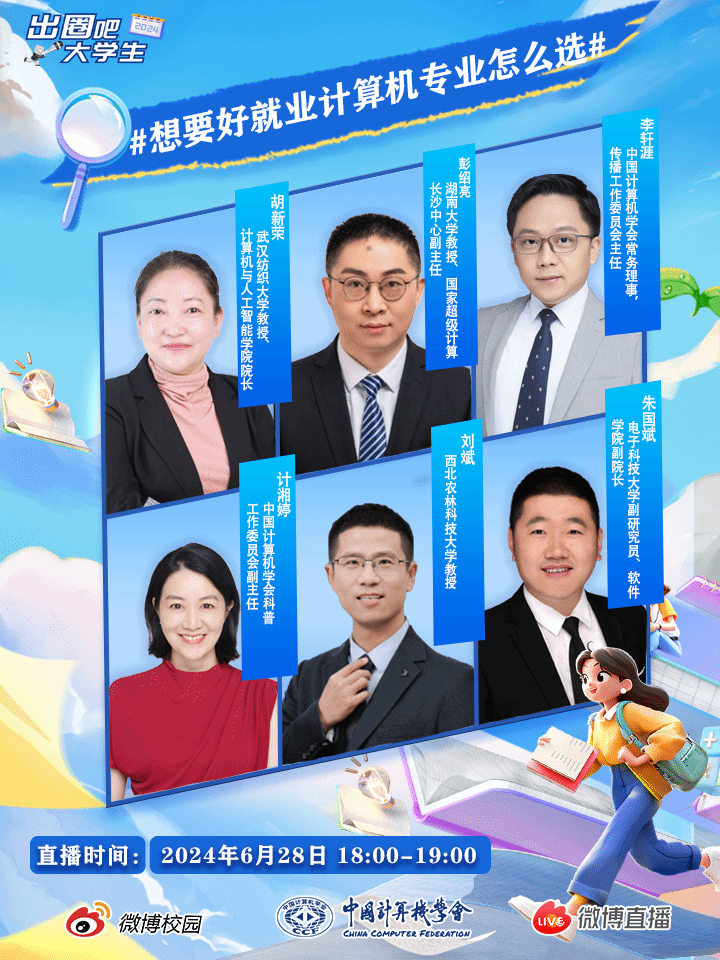 又到了高考填志愿的时候!为帮助考生、家长更全面地了解计算机、软件、人工智能等专业,更科学地填报志愿。6月28日下午,应中国计算机学会邀请,开云kaiyun体育官方网站院长胡新荣和湖南大学、电子科技大学、西北农林大学等专家同台通过微博直播介绍各学校和学院。