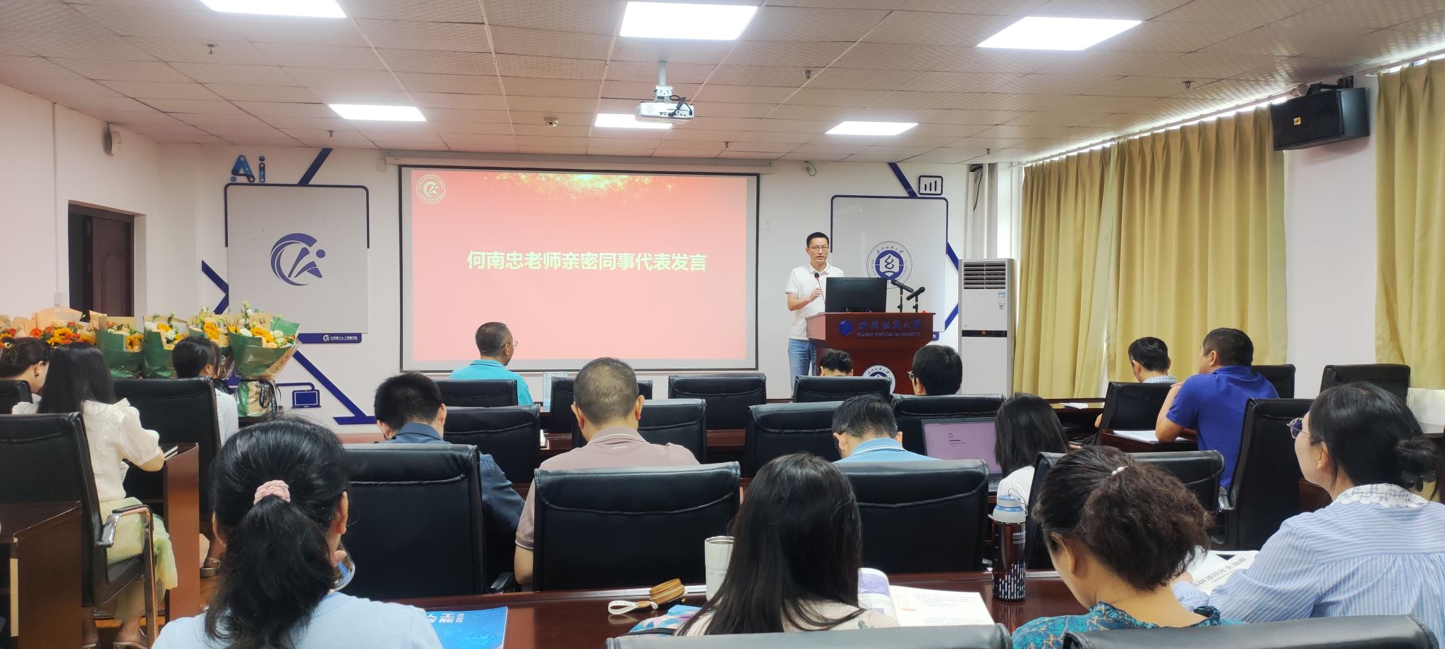 学院为何南忠老师举行了隆重的荣休仪式。在荣休仪式上,副院长彭涛作为何老师的亲密同事,为何老师的工作生涯做了全面评价。他用真实的案例提到,何老师在工作态度、纪律方面严谨认真,为工程认证做出了突出贡献;在专业实践和关爱学生方面,更是以身作则,深受师生好评。他的讲话充满了对何老师的敬意与感激,展现了何老师在教育事业上的深远影响和对学生的深情厚谊。