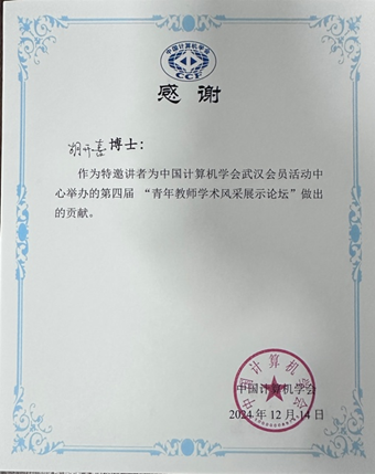 2024年12月14日由CCF武汉会员活动中心(简称:CCF武汉)主办,武汉科技大学承办的CCF武汉第四届青年教师学术风采展示论坛在武汉科技大学黄家湖校区举行。CCF武汉自2012年11月24日成立之日起,始终秉承学会和会员活动中心的使命与愿景,在“家门口”为武汉以及周边地区会员服务。本次主办的青年教师学术风采展示论坛由华中科技大学郑渤龙教授和武汉理工大学袁景凌教授担任主席,汇聚了来自武汉大学、华中科技大学、武汉理工大学、华中师范大学、华中农业大学、中国地质大学(武汉)等6所部属高校和武汉科技大学、武汉纺织大学、湖北工业大学、武汉工程大学等4所省属高校共13名青年教师。论坛上,我院教师陈佳教授和青年博士胡开喜分别报告了AI赋能发展新质生产力的前沿产业应用和顶级期刊会议上的最新研究成果,与各位青年学者展开了积极的讨论。