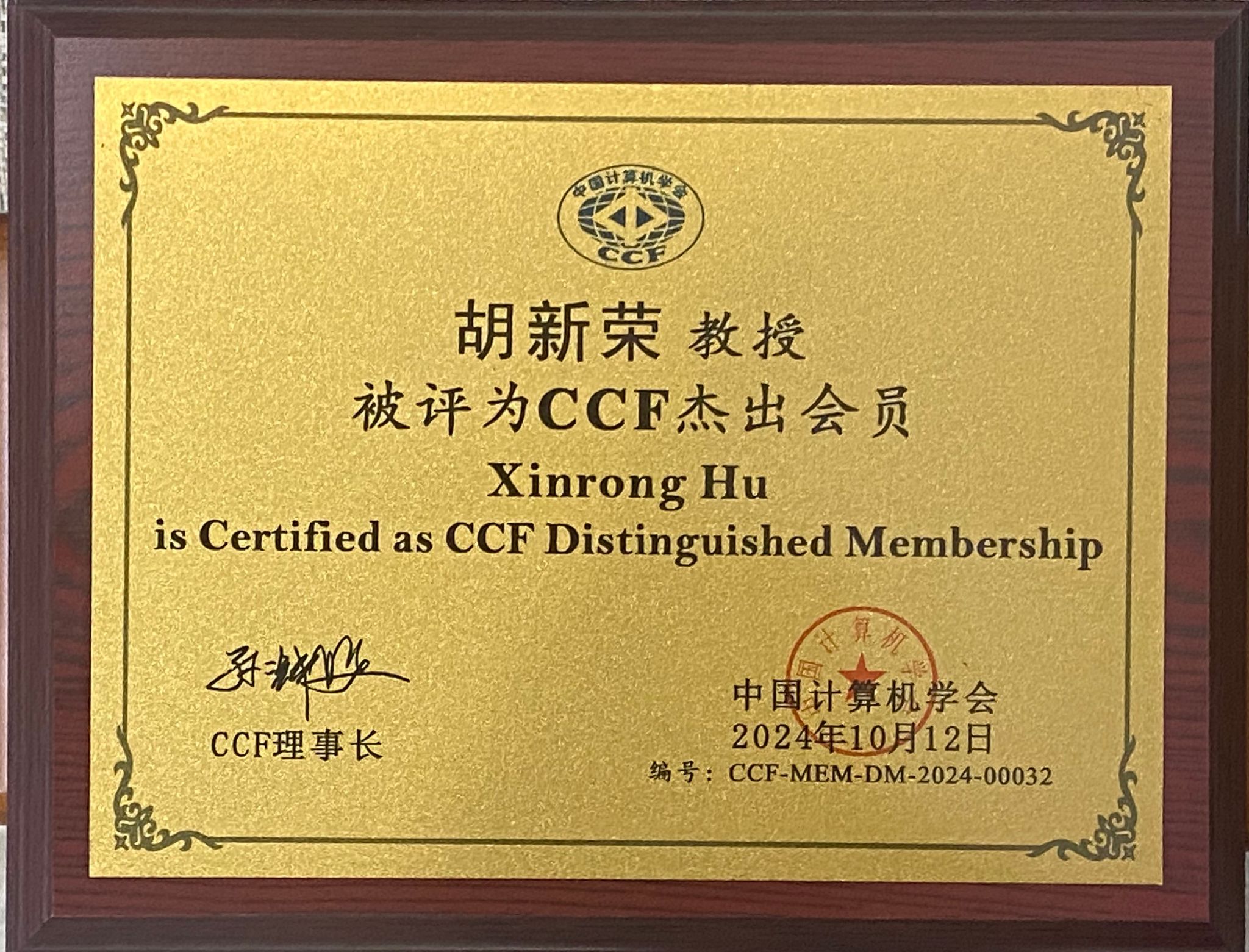 据悉:CCF是中国计算机领域最具影响力的专业学术团体之一,其会员级别分为学生会员、专业会员、高级会员、杰出会员和会士。其中,杰出会员是CCF会员资格中的最高荣誉,授予那些在计算领域取得显著成就、拥有至少15年专业经验以及至少5年CCF会龄的会员。2024年,全国共有360位会员获此殊荣,胡新荣教授的当选,标志着其在计算机科学领域的专业水平和学术贡献得到了业界的高度评价。