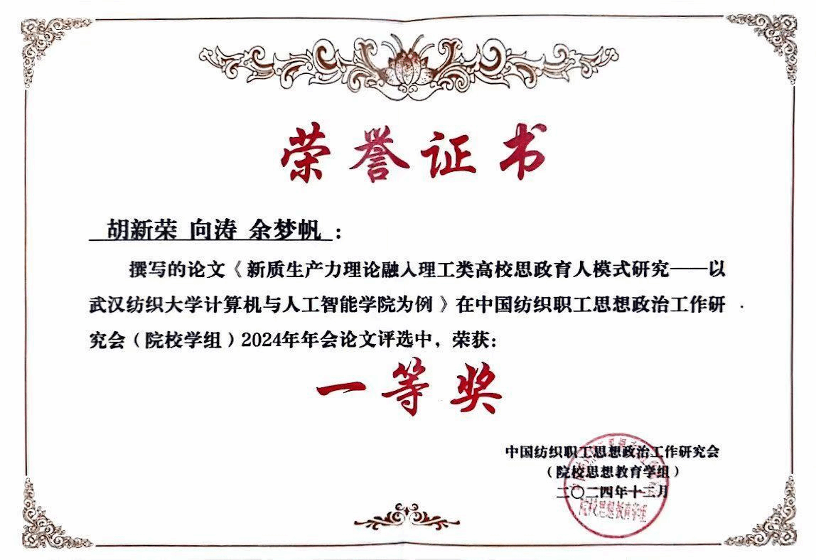 近日,我院胡新荣、向涛、余梦帆撰写的论文《新质生产力理论融入理工类高校思政育人模式研究——以武汉纺织大学开云kaiyun体育官方网站为例》在中国纺织职工思想政治工作研究会(院校学组)2024年年会论文评选中荣获一等奖。