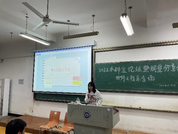 会上,三名优秀的学长学姐分享了实习和考研经验。优秀党员代表——2018级软件工程系学生董林、许小强分别被大连理工大学和西安交通大学录取。他们结合自身经历介绍考研需要注意的问题,如重要的时间节点、考研大纲、报名途径、硕士分类等信息,并结合自身考研经验,对考研复试的整体流程、复试内容、设备调试、答题方法、注意事项等方面进行了逐一讲解。