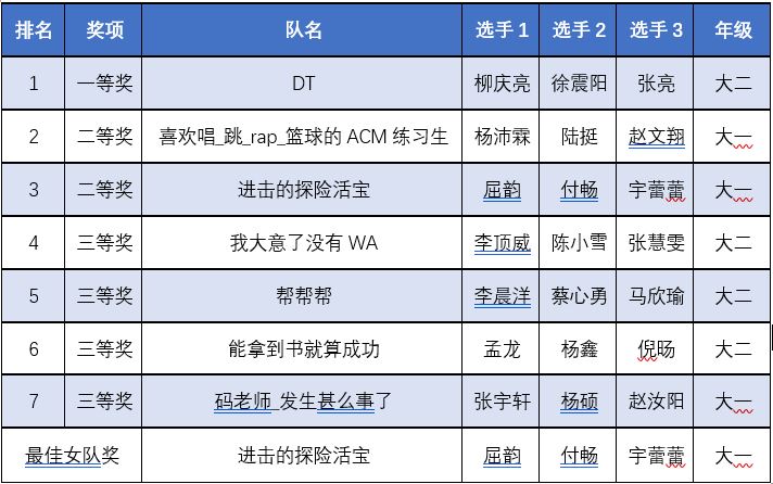 通过本次竞赛,让更多同学认识到程序设计的不同,感受竞赛的趣味。此次竞赛也能开出不少新生的势头非常的足,再众多学长学姐的压力下也取得了不俗的成绩,改良了同学们的学习风气。程序设计竞赛不仅是选手和选手之间的比拼,也是出题人和选手之间的对抗,这场比赛也透露出一些问题,题目难度略微偏大、有些题目描述不够清晰,之后这些问题会加以改进。总的来说比赛是圆满完成,希望之后的比赛会有更多同学参加,有更多同学对编程产生新的兴趣!