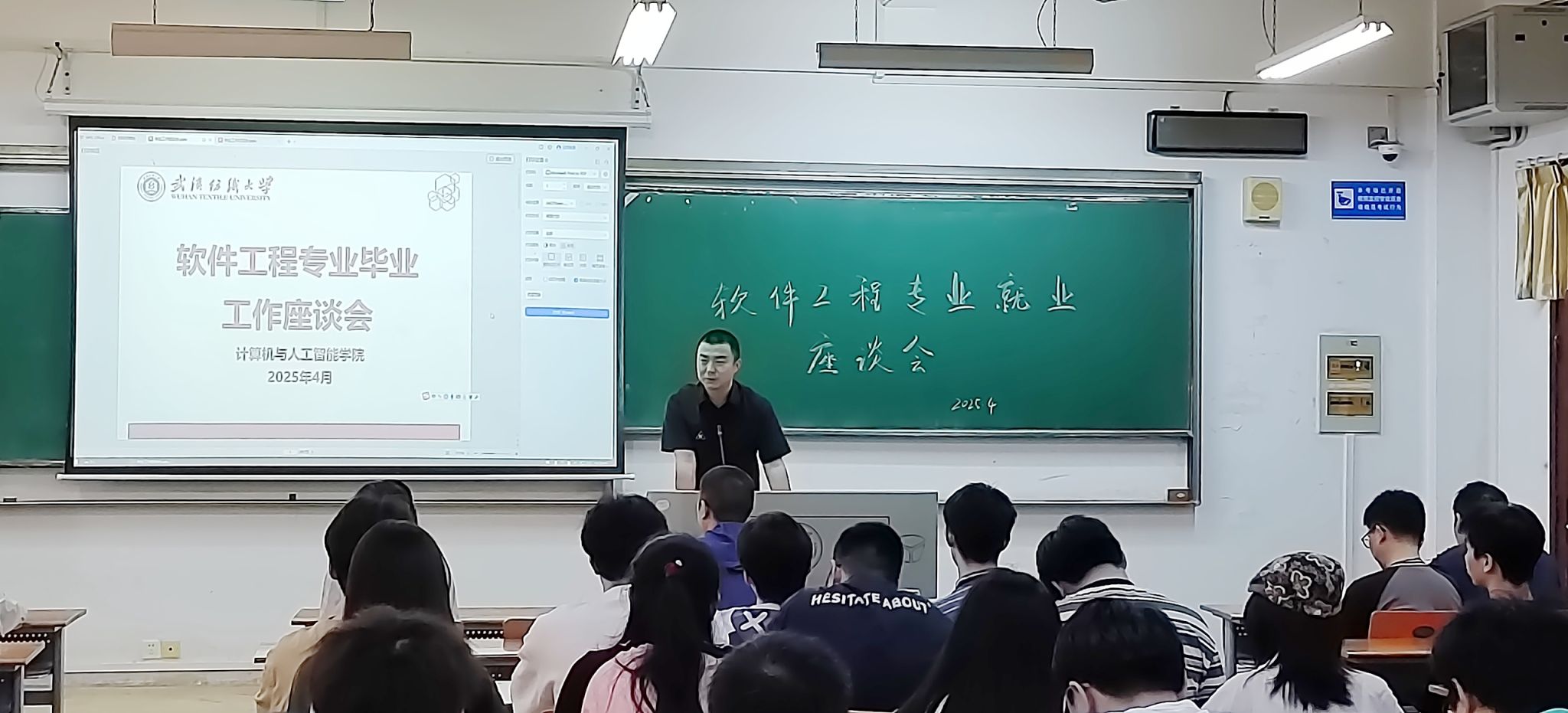 叶鹏表示,软件工程专业学子无论是在校内还是校外,都代表着武汉纺织大学的形象,肩负着学校荣誉,希望同学们能严于律己。他也建议同学们遇到问题多与本科生导师谈心交流。同时,他着重提醒同学们注意毕业论文时间节点,确保按时按质完成。还提到就业情况不太理想的同学能在剩下不到两个月的时间里,抓紧落实就业工作,这不仅是对自己负责,也是对学校负责。
