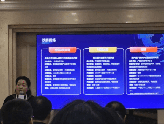 论坛始伊,来自开放原子开源基金会、教育培训部资深顾问韩江先生对于论坛的举办致辞。来自北京软通动力科技教育有限公司的产品中心总经理刘静女士以《open Harmony在物联网专业课程体系中的应用与实践》为题为我们带来了生动的演讲。Open Harmony技术俱乐部资深导师以《面向不同院校的open Harmony培养方案》为题与大家分享了院校运用open Harmony进行培养的方法。武汉华夏理工学院信息工程院院长夏婷女士向大家分享了open Harmony的校企合作实践成果。西南科技大学计算机科学与技术学院贾小林副院长,与我们进一步探讨了《本科操作系统open Harmony化课改方案》。来自浙江万里学院的梁丰教授发表了以《开源共创打造鸿蒙教育新形态》为题的演讲,在此次讲话中,梁教授提到要重视学生基础教学,如c语言等基础编程语言的学习,并且向我们阐述了其中的重要性。来自北京软通动力技术研究院有限公司、软通计算研究院营销总监齐悦先生以《教育新创与AI发展趋势探讨》为题的讲话,齐悦总监提到目前教育软件的AI化对于学生学习的好处和其今后的发展。深圳鸿湖万联科技发展有限公司产融方案总经理连志安先生发表了以《OpenHarmony产教融合与人才培养实践》为题的演讲。最后,由唐佐林老师主持的以《如何高效的实现开源背景下的惨叫融合方案》为题的圆桌讨论也顺利展开,在此次讨论中,各位专家学者提到,在对学生教育的同时,老师的教育培训同样也至关重要,只有两者同时进行才能达到更好的效果。此外,此次论坛还设立了激动人心的抽奖环节,创新班的同学不仅收获了宝贵的知识,也得到了其他的精美礼品。